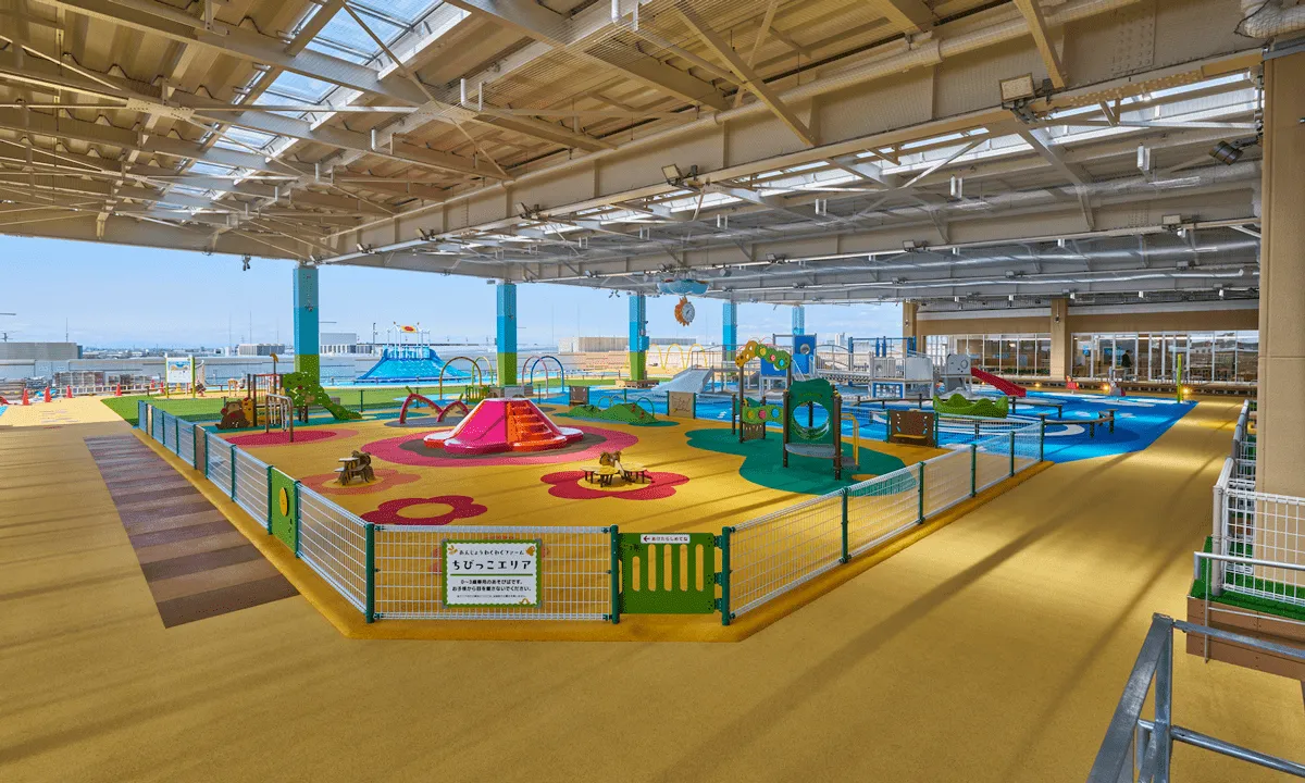 The highlight of the facility is the 3,800-square-meter Rooftop Park—Japan’s largest rooftop playground, with 46 pieces of equipment and over 60 different activities. Divided into six themed zones, more than half the space is covered by a wide canopy, letting families enjoy the park comfortably in both sun and rain. The artificial turf lawn also welcomes food and drinks, perfect for a relaxed picnic-style outing.