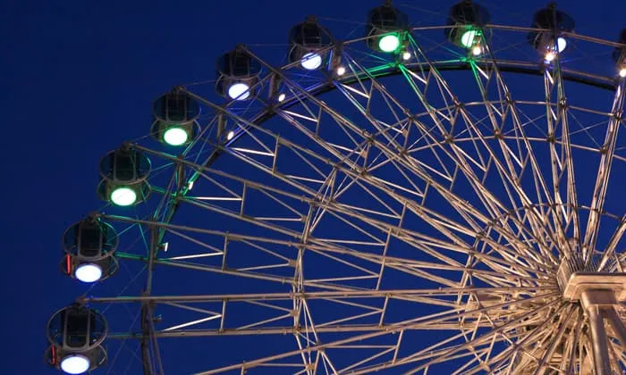 在搭乘摩天轮的15分钟内,可以饱览荣商圈川流不息的街道、多彩的招牌霓虹灯、绿洲21等。摩天轮常与偶像、动漫联名合作,搭乘时会播放相关音乐,让喜爱的偶像陪你一同赏夜景。