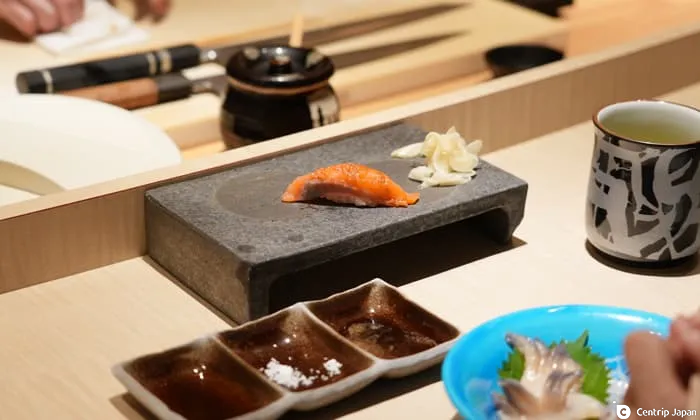 推薦坐板前座位,可以欣賞師傅高超俐落的切魚、捏壽司技術,簡直是藝術表演,光看就已值回票價。許多外國旅客都忍不住拿出手機錄影呢!
