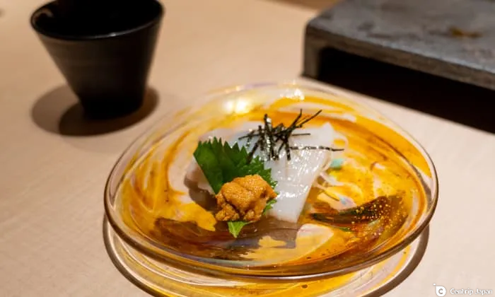 小編實際體驗了「高級無菜單壽司(プレミアムおまかせ)」,只能說是超乎想像的驚艷!先是湯品暖胃,接著是生魚片、貝類、握壽司、奶油醬油烤鮑魚、花枝素麵(將花枝切成細條狀沾海膽醬)、海膽、手捲壽司、甜點。清淡、濃郁、熱、冷⋯⋯上菜順序經過精心安排,像是體驗了場高潮迭起的饗宴。
